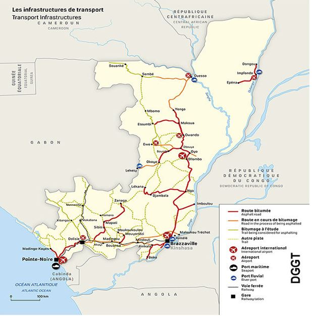 Tributaire d’un réseau routier, en pleine réhabilitation de plus de 20 000 Km, desservant les zones septentrionales du Congo Brazzaville, le Bas Congo (Sud-Ouest de RDC), l’Angola (l’enclave de Cabinda) et le Sud Gabon. Il dispose de six (6) routes nationales dont les principales sont la RN1 reliant Brazzaville à Pointe-Noire (574 km) et la RN2 Brazzaville à Ouesso (870 km).